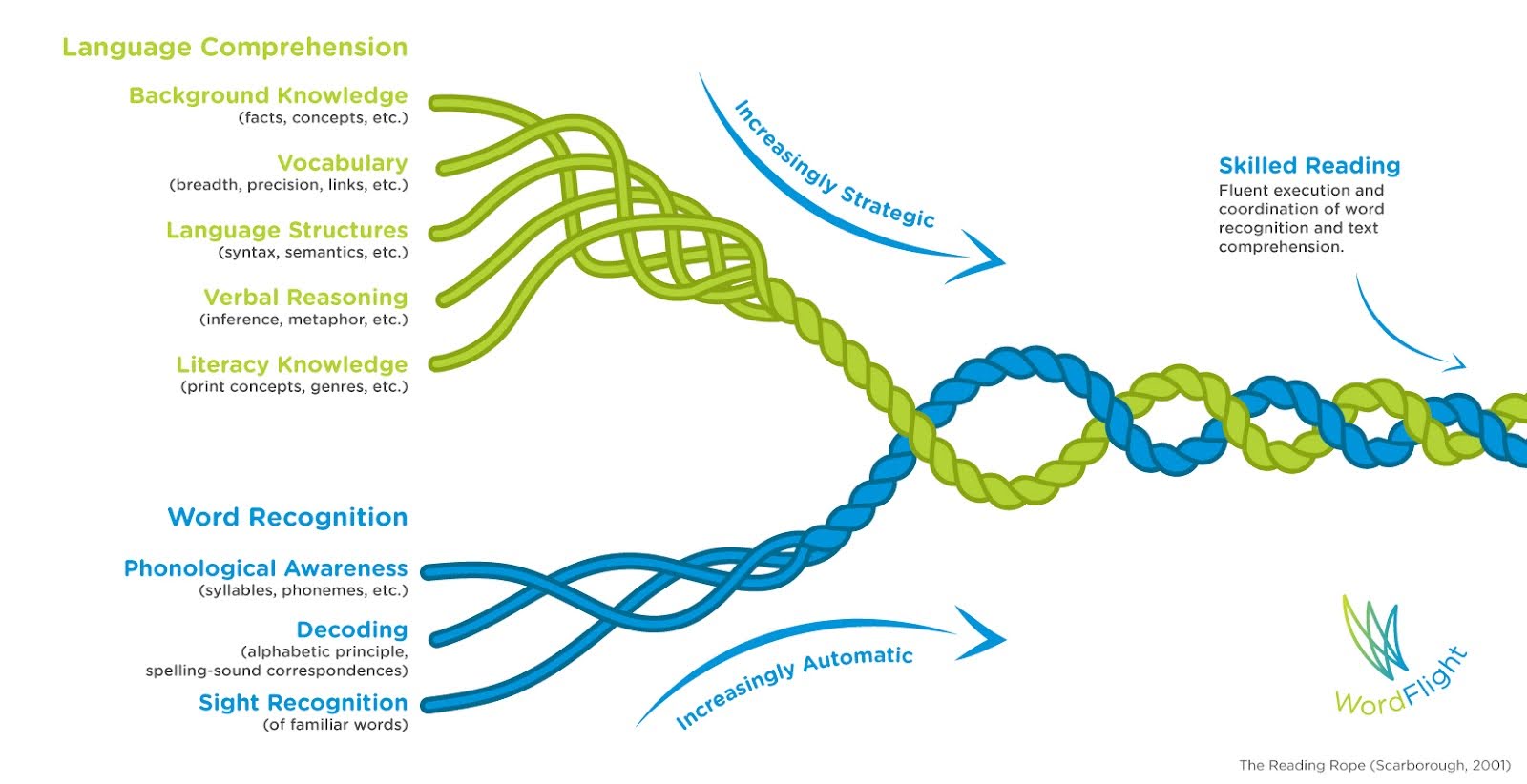 Dr. Hollis Scarborough, a leading reading researcher, studied the relationship between early language development and literacy. She created the Reading Rope as a visual metaphor to demonstrate the interaction of the skills needed to become a proficient reader (2001).